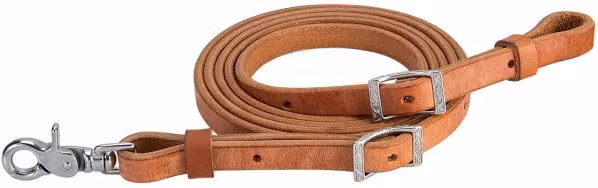 Crafted from 5/8" rugged, weather resistant Hermann Oak russet harness leather, this rein has a great feel in the hands. This rein is highlighted with Horse Shoe Brand floral stainless steel conway buckles designed by custom saddlemaker Jeremiah Watt that offer the perfect combination of beauty and function. Non-rust stainless steel scissor snap. Measures 5/8" x 8'.